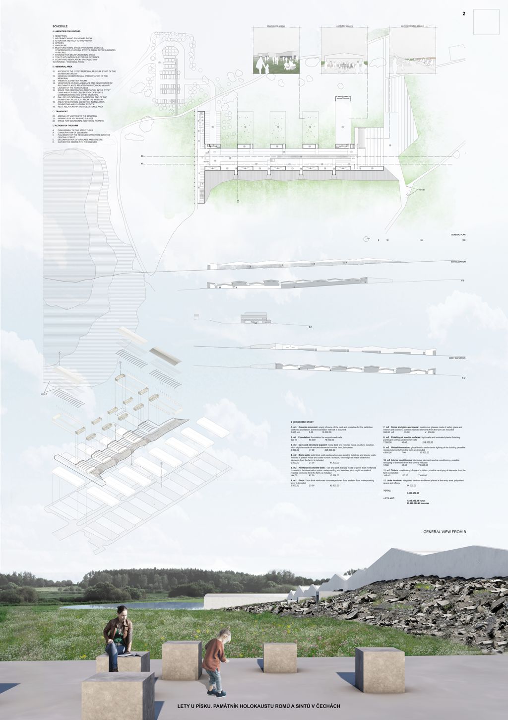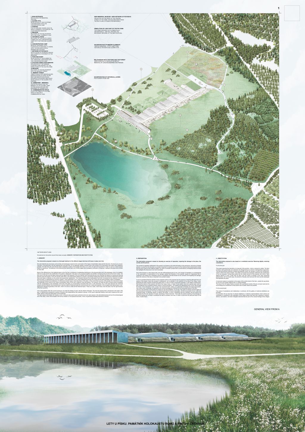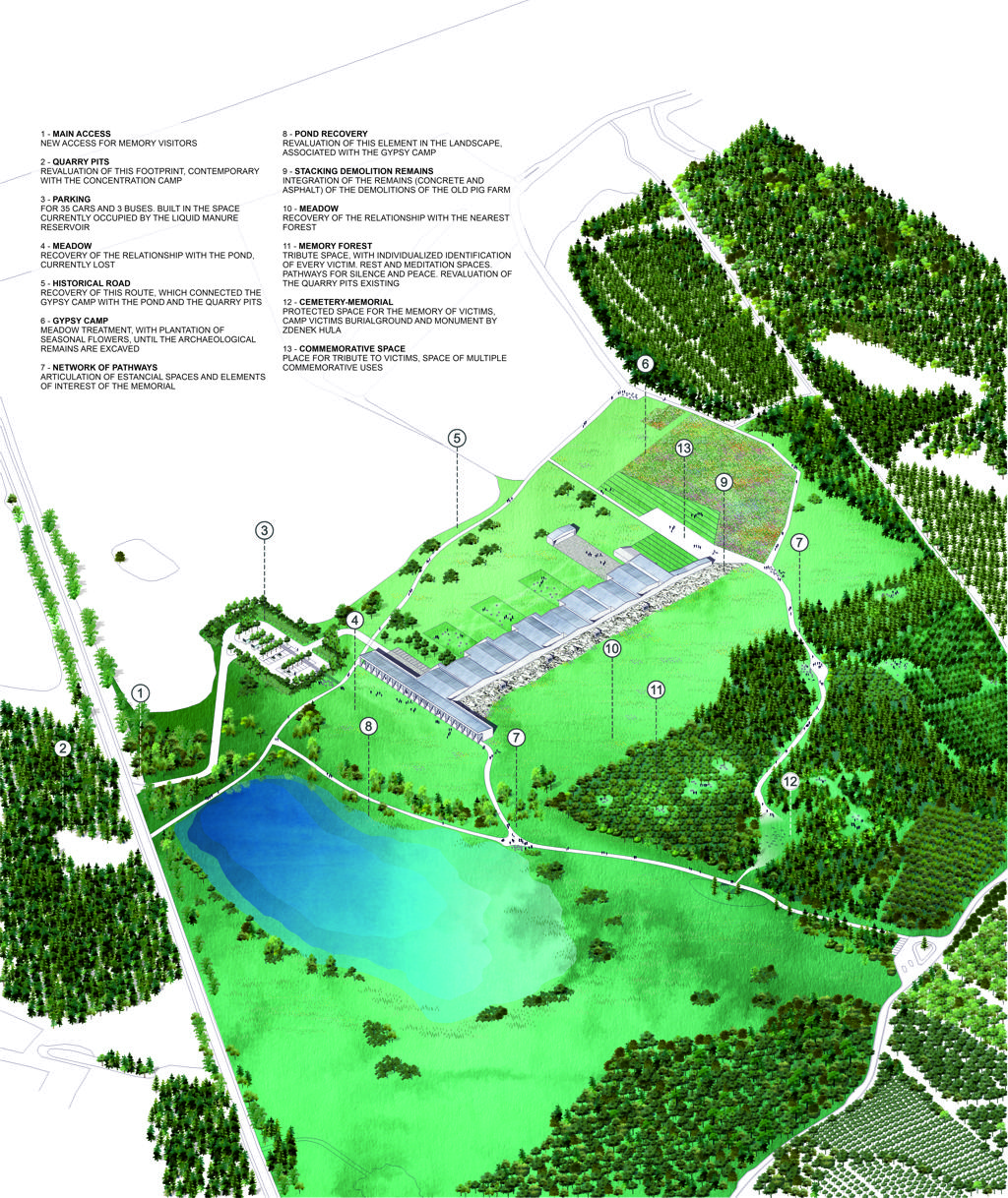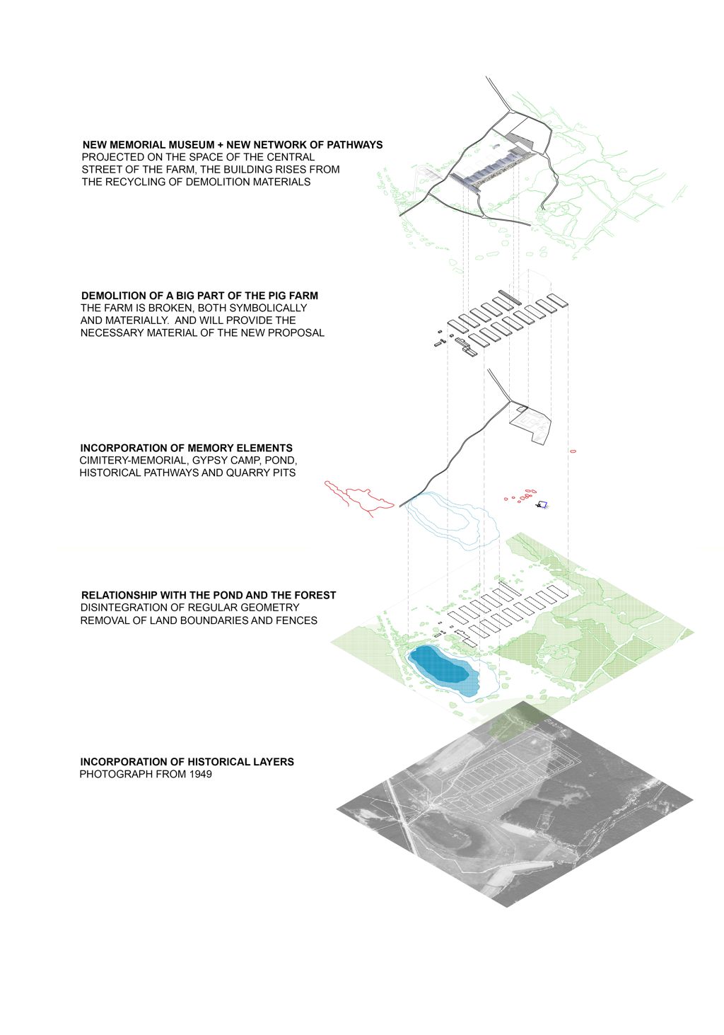 La propuesta desarrolla la arquitectura de un espacio museístico Memorial donde se contará, ayudado de diferentes soportes y en diferentes espacios de una manera exhaustiva la historia del lugar, de los hechos acaecidos, de las personas que intervinieron en ellos y especialmente de las victimas del Campo de concentración Gitano. El museo hará compatible el relato de estos hechos con la contemplación del paisaje donde tuvieron lugar, mediante la incorporación de unos miradores que abarcan una panorámica amplia de la zona entre este museo memorial y el área memorial Zdeněk Hůla. Así mismo se recuperan trazados de caminos históricos y se proyectan nuevos recorridos, con un trazado orgánico y natural, que se sobrepongan a la geometría ortogonal de la granja, que vendrán a relacionar todas las capas históricas. Estos nuevos caminos, que atraviesan libremente el lugar, desdibujan la estructura rígida de los pabellones de la granja.