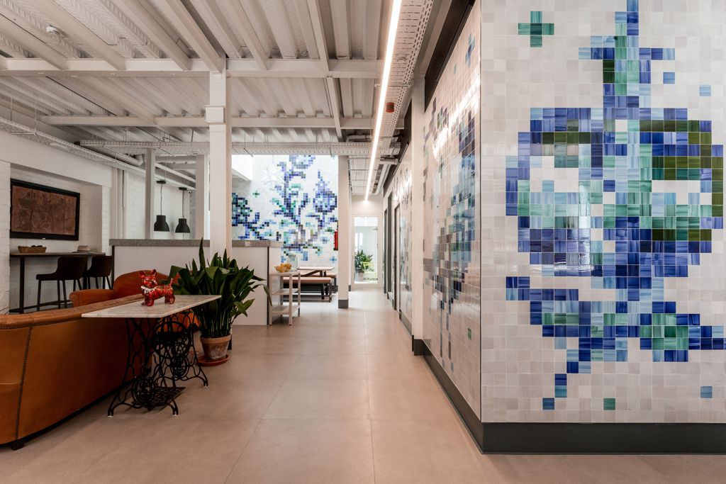 Los grandes murales de mosaicos cerámicos que recorren los paramentos del edificio recogen la tradición y la actualizan para un nuevo observador. Su diseño juega con él, cambiando su percepción en función de la distancia: mientras que la vista lejana desvela algunos de los motivos típicos de la cerámica granadina (guirnaldas de hojas, flores, granadas y pájaros), desde cerca se desdibujan hasta convertirse en un damero abstracto de vidriados verdes, azules y blancos, sus colores tradicionales desde el siglo XVI. Estas cerámicas han sido realizadas a mano en Granada, en los hornos del artista y ceramista Miguel Ruiz Jiménez.