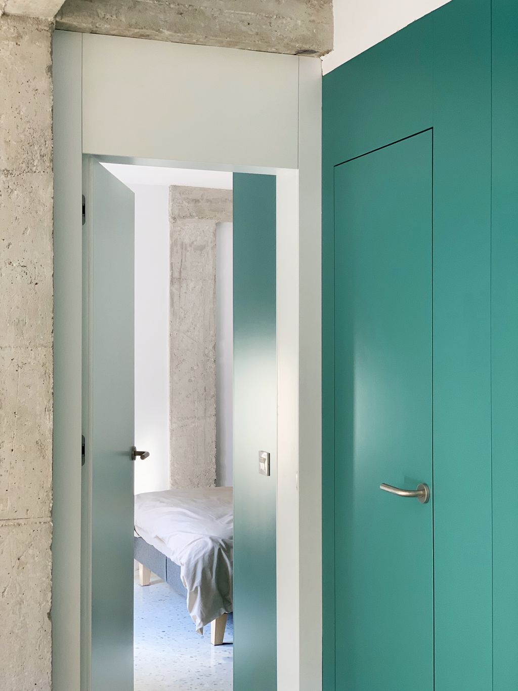 La reforma plantea la apertura de los espacios interiores, permitiendo una mayor fluidez de recorridos y circulación de la luz. La nueva distribución se articula en torno a una nueva banda funcional que se dispone en el centro de la vivienda e integra carpinterías, armarios y otros espacios de almacenaje, construida en madera lacada.